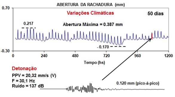 Um sensor de deslocamento também é instalado em uma rachadura existente com o objetivo de medir a variação na abertura da mesma com a influência das vibrações oriundas das detonações, e as variações resultantes da influência diária (24 horas) das oscilações climáticas (variações em temperatura e umidade relativa do ar). Este estudo visa demostrar que os níveis de vibrações resultantes de detonações bem planejadas e controladas não podem resultar em danos a estruturas, estando estes níveis abaixo da Norma Brasileira ABNT NBR 9653. É possível também demostrar que outras forças, que atuam diariamente sobre as estruturas, exercem maior influência sobre os materiais constituintes das paredes das estruturas, do que os impactos causados pelas detonações.